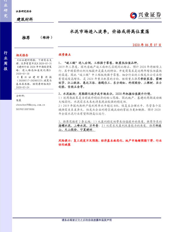 【兴业证券】【20200607】水泥市场进入淡季,价格或将高位震荡-17页 行业研究