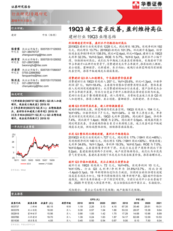 【华泰证券】【20191103】建材行业19Q3业绩总结:19Q3竣工需求改善,盈利维持高位-23页 行业研究