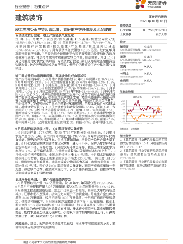 【天风证券】【20211018】建筑装饰:竣工需求受限电等因素后置,看好地产链条修复及水泥玻璃-4页 行业研究