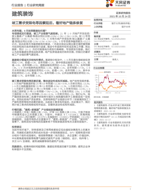 【天风证券】【20211024】建筑装饰:竣工需求受限电等因素延后,看好地产链条修复-7页 行业研究
