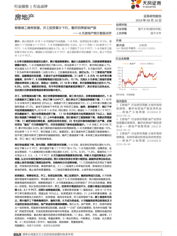【天风证券】【20190916】8月房地产统计数据点评:销售竣工略有恢复,开工投资累计下行,看好四季度地产股-8页 行业研究