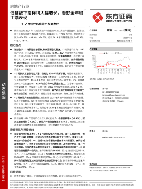 【东方证券】【20210316】1-2月统计局房地产数据点评:低基数下指标均大幅增长,看好全年竣工端表现-11页 行业研究