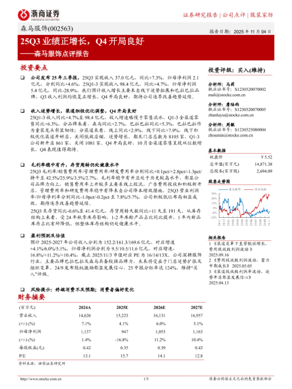 【浙商证券】【202511】25Q3业绩正增长,Q4开局良好——森马服饰点评报告-3页 证券期货研究报告