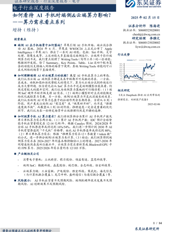 【东吴证券】【202502】电子行业深度报告:如何看待AI手机对端侧&云端算力影响?-14页 行业研究