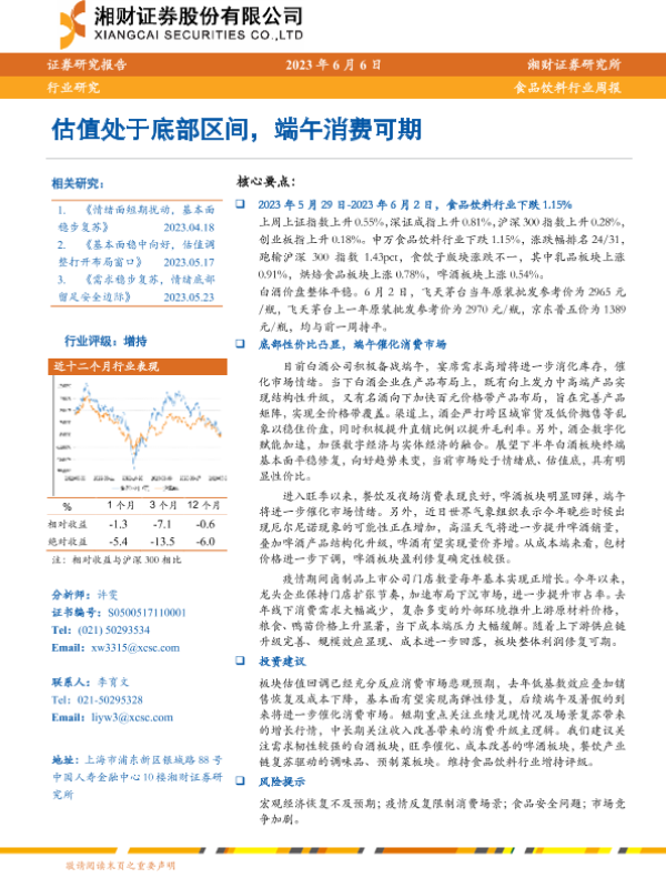 【湘财证券】【20230606】20230606-湘财证券-食品饮料行业周报:估值处于底部区间,端午消费可期-11页 行业研究