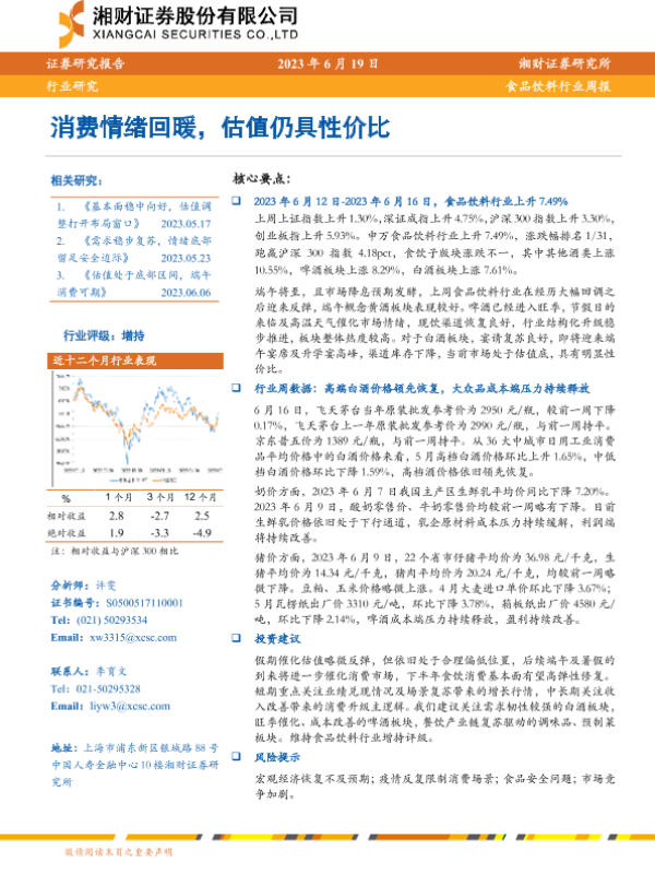 【湘财证券】【20230619】20230619-湘财证券-食品饮料行业周报:消费情绪回暖,估值仍具性价比-10页 行业研究