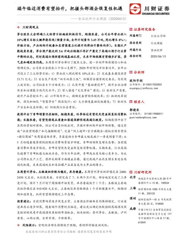 【川财证券】【20200613】20200613-川财证券-食品饮料行业周报:端午临近消费有望抬升,把握头部酒企恢复性机遇-13页 行业研究