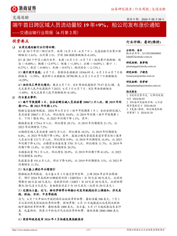 【浙商证券】【20240609】交通运输行业周报(6月第2周):端午首日跨区域人员流动量较19年+9%,船公司发布涨价通知-17页 行业研究