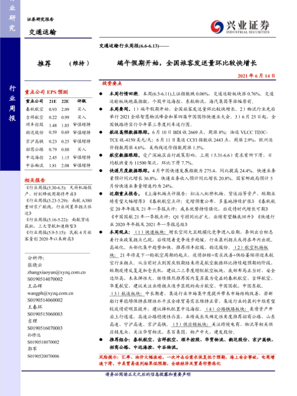 【兴业证券】【20210614】交通运输行业周报:端午假期开始,全国旅客发送量环比较快增长-18页 行业研究