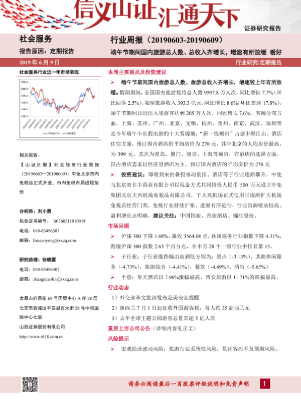 【山西证券】【20190609】社会服务行业周报:端午节期间国内旅游总人数、总收入齐增长,增速有所放缓-9页 行业研究