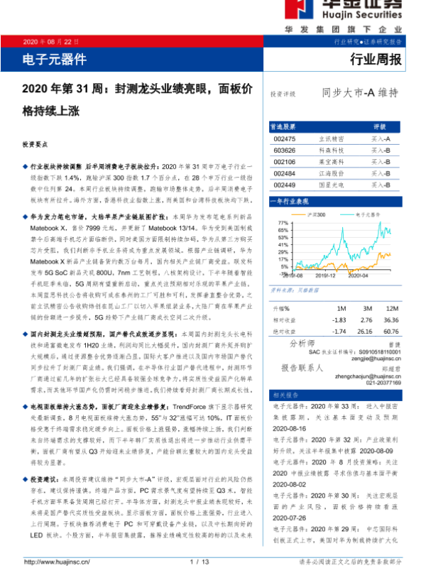 【华金证券】【20200822】2020年第31周:封测龙头业绩亮眼,面板价格持续上涨-13页 行业研究