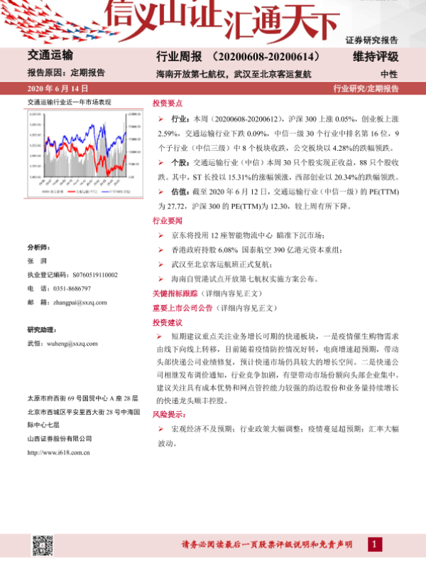 【山西证券】【20200614】交通运输行业周报:海南开放第七航权,武汉至北京客运复航-15页 行业研究