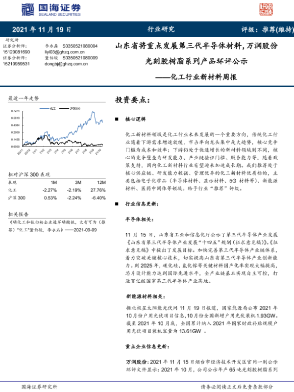 【国海证券】【20211119】20211119-国海证券-化工行业新材料周报:山东省将重点发展第三代半导体材料,万润股份光刻胶树脂系列产品环评公示-34页 行业研究