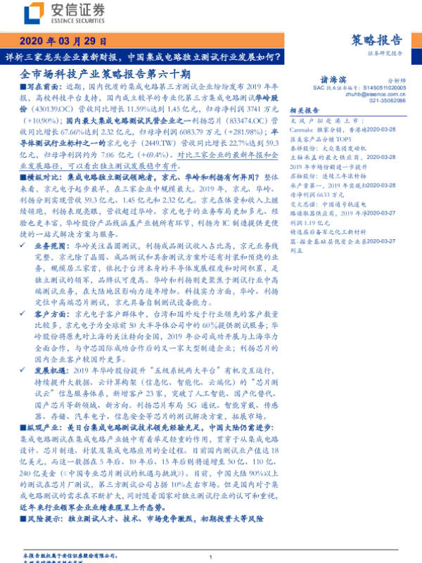 【安信证券】【20200329】科技行业全市场科技产业策略报告第六十期:详析三家龙头企业最新财报,中国集成电路独立测试行业发展如何?-37页 行业研究