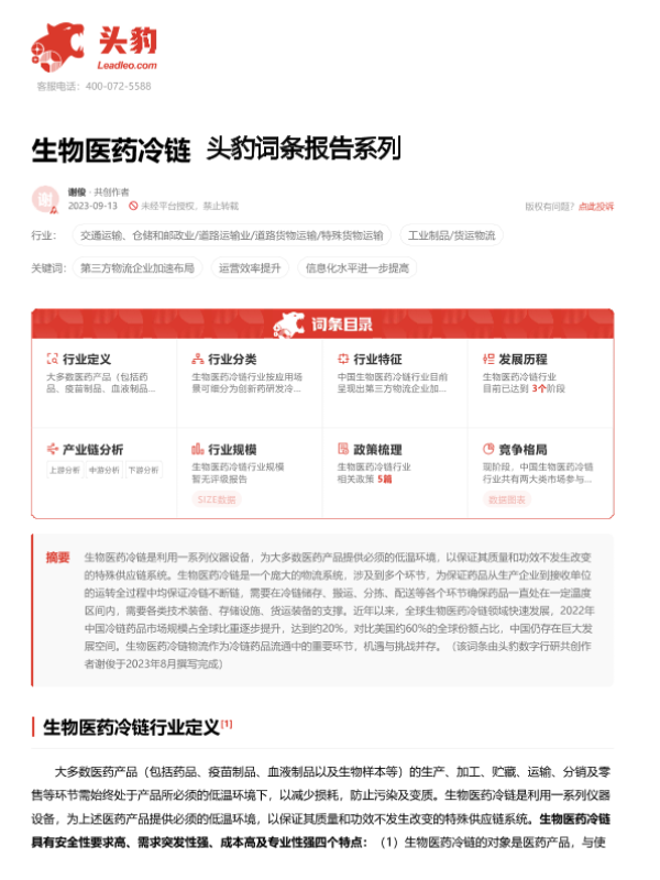 【头豹研究院】【20240111】生物医药冷链 头豹词条报告系列-18页 行业研究