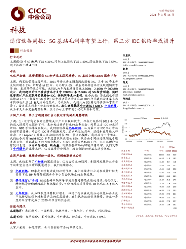 【中金公司】【20210314】通信设备周报:5G基站毛利率有望上行,第三方IDC供给率或提升-11页 行业研究