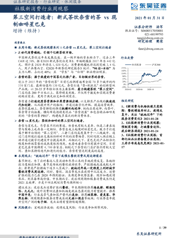 【东吴证券】【20210131】社服新消费行业周观察:第三空间打造者:新式茶饮奈雪的茶vs现制咖啡星巴克-39页 行业研究