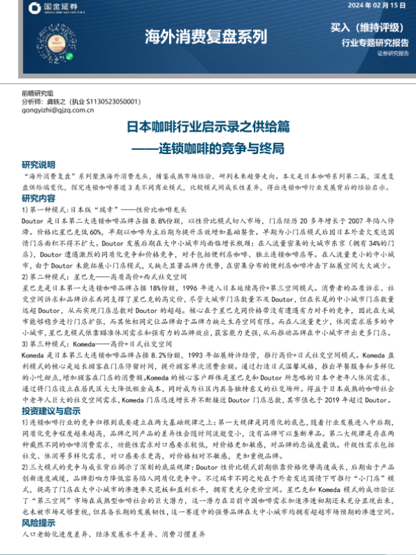 【国金证券】【20240215】海外消费复盘系列:日本咖啡行业启示录之供给篇-连锁咖啡的竞争与终局-28页 行业研究