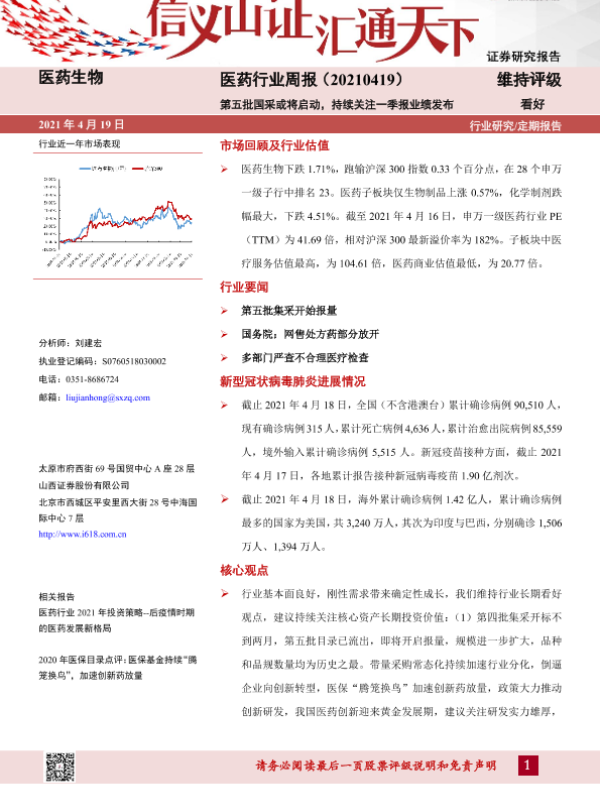 【山西证券】【20210419】医药行业周报:第五批国采或将启动,持续关注一季报业绩发布-8页 行业研究