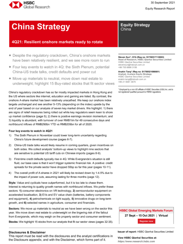 【HSBC Qianhai Securities Limited】【20210930】HSBC-中国投资策略-2021年第四季度:有弹性的国内市场准备轮换-40页 行业研究