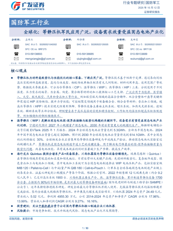 【广发证券】【202510】全球化:等静压机军民应用广泛,设备需求放量受益固态电池产业化-30页 证券期货研究报告