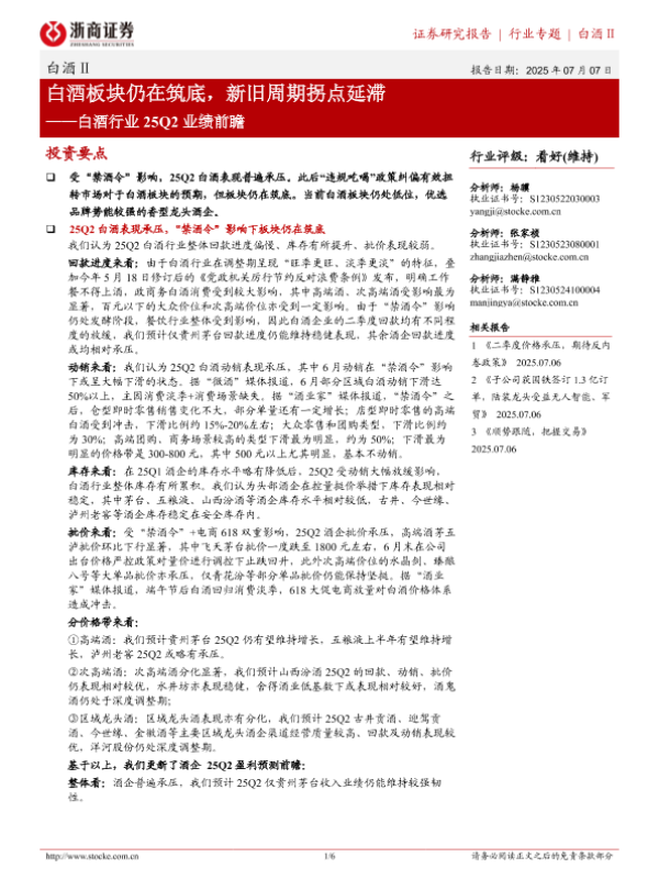【浙商证券】【20250707】白酒行业25Q2业绩前瞻_白酒板块仍在筑底_新旧周期拐点延滞-6页 行业研究
