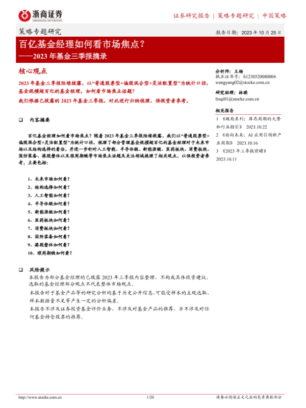 【浙商证券】【20231025】2023年基金三季报摘录:策略专题研究百亿基金经理如何看市场焦点?-20页 行业研究