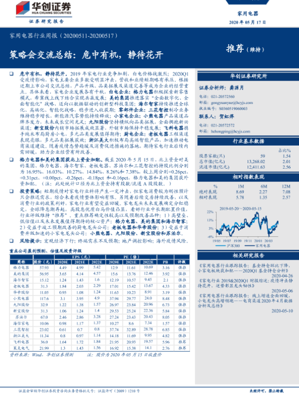 【华创证券】【20200517】20200517-华创证券-家用电器行业周报:策略会交流总结:危中有机,静待花开-16页 行业研究