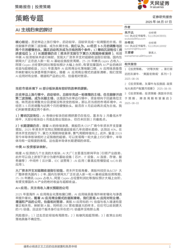 【天风证券】【20250807】AI主线归来的探讨-8页 证券期货研究报告