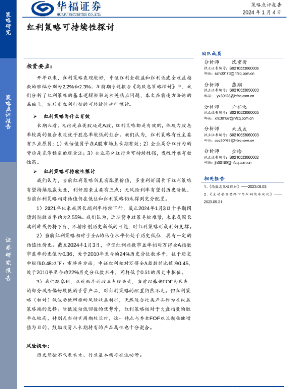 【华福证券】【20240104】策略点评报告:红利策略可持续性探讨-15页 行业研究
