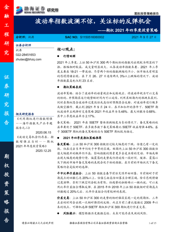 【渤海证券】【20210927】期权2021年四季度投资策略:波动率指数波澜不惊,关注标的反弹机会-15页 行业研究