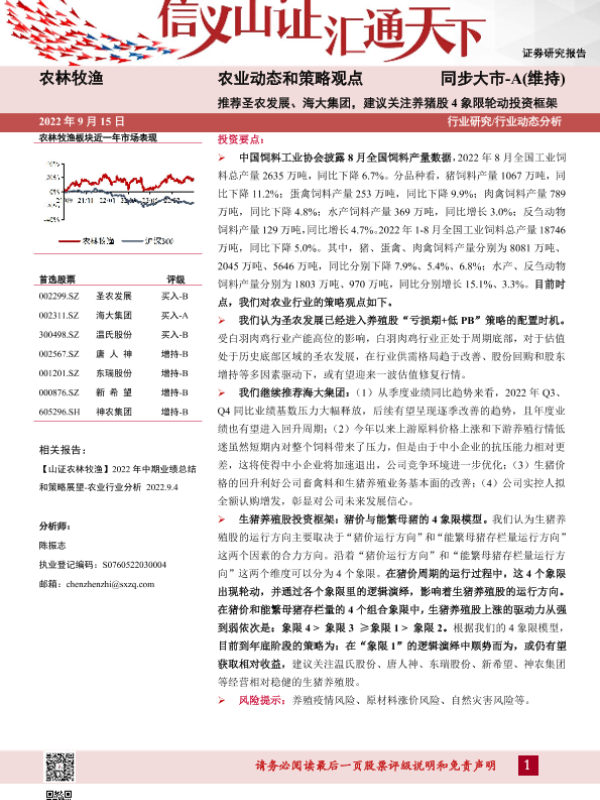 【山西证券】【20220915】农业动态和策略观点:推荐圣农发展、海大集团,建议关注养猪股4象限轮动投资框架-9页 行业研究