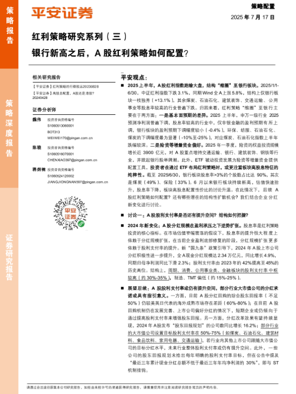 【平安证券】【20250717】红利策略研究系列(三):银行新高之后,A股红利策略如何配置?-18页 证券期货研究报告
