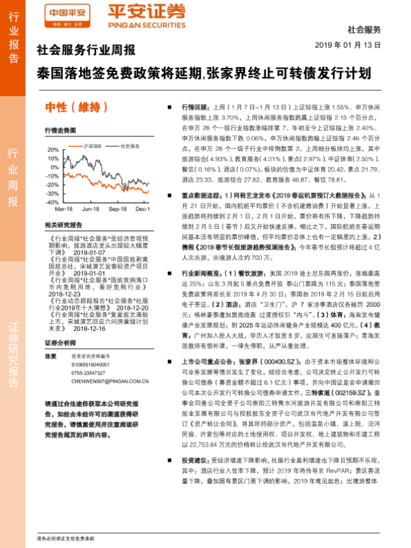 【平安证券】【20190113】社会服务行业周报:泰国落地签免费政策将延期,张家界终止可转债发行计划-10页 行业研究