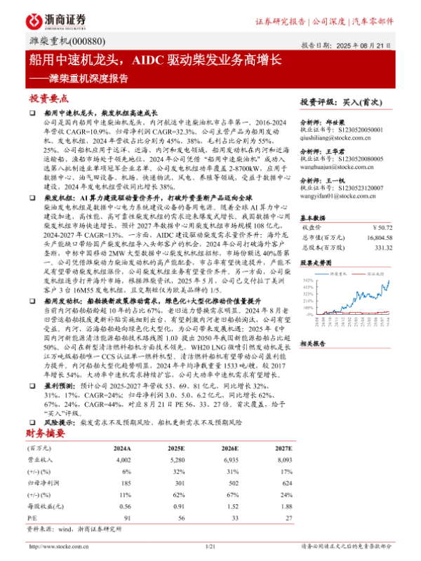 【浙商证券】【202508】船用中速机龙头,AIDC驱动柴发业务高增长-21页 证券期货研究报告