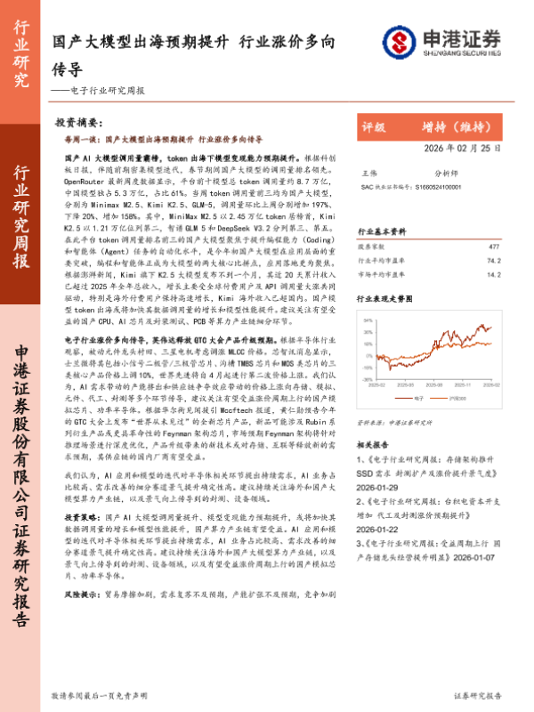 【申港证券】【202602】国产大模型出海预期提升行业涨价多向传导——电子行业研究周报-10页 证券期货研究报告