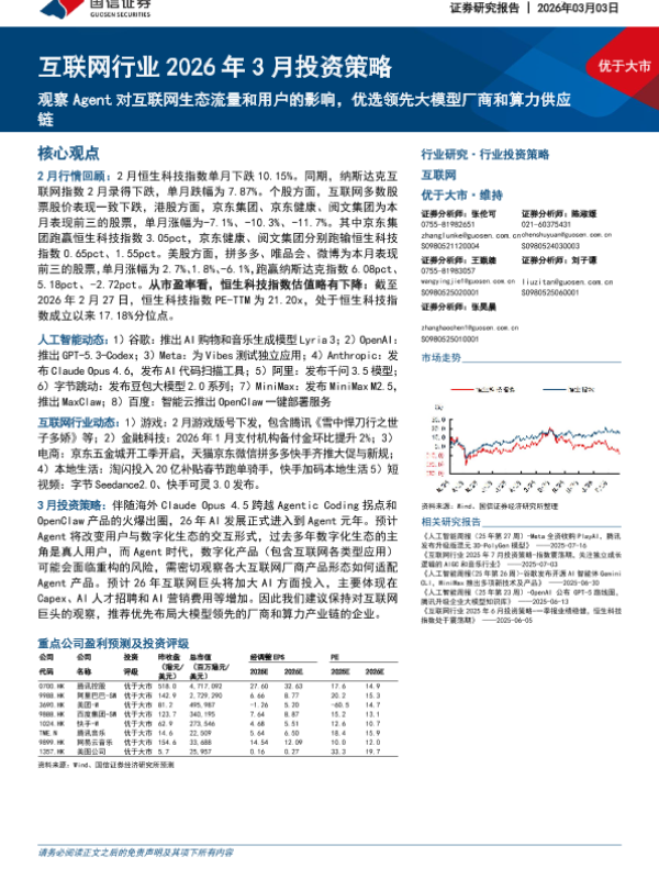 【国信证券】【202603】优于大市 互联网行业 2026年 3月投资策略-17页 证券期货研究报告