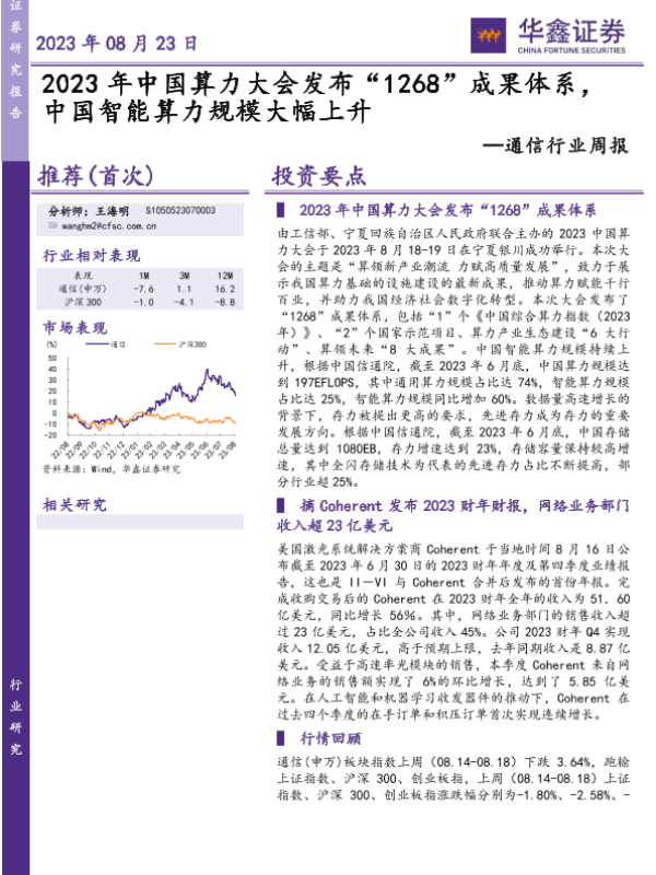 【华鑫证券】【20230823】通信行业周报:2023年中国算力大会发布“1268”成果体系,中国智能算力规模大幅上升-30页 行业研究