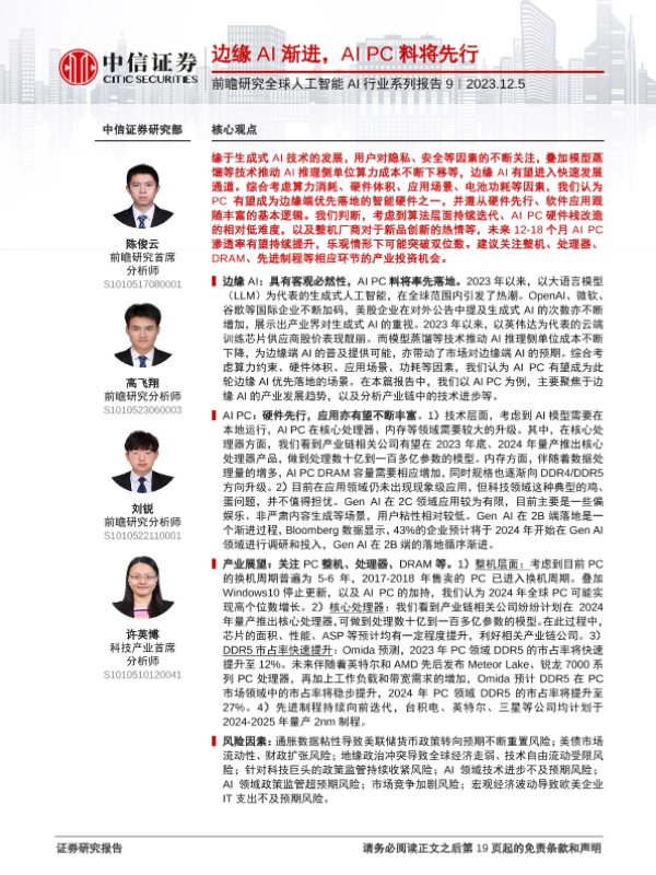 【中信证券】【20231205】前瞻研究全球人工智能AI行业系列报告:边缘AI渐进,AI PC料将先行-19页 行业研究