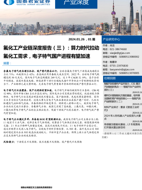 【产业研究中心】【20240126】2024年03月19日更新-氟化工产业链深度报告(三):算力时代拉动氟化工需求,电子特气国产进程有望加速-13页 行业研究