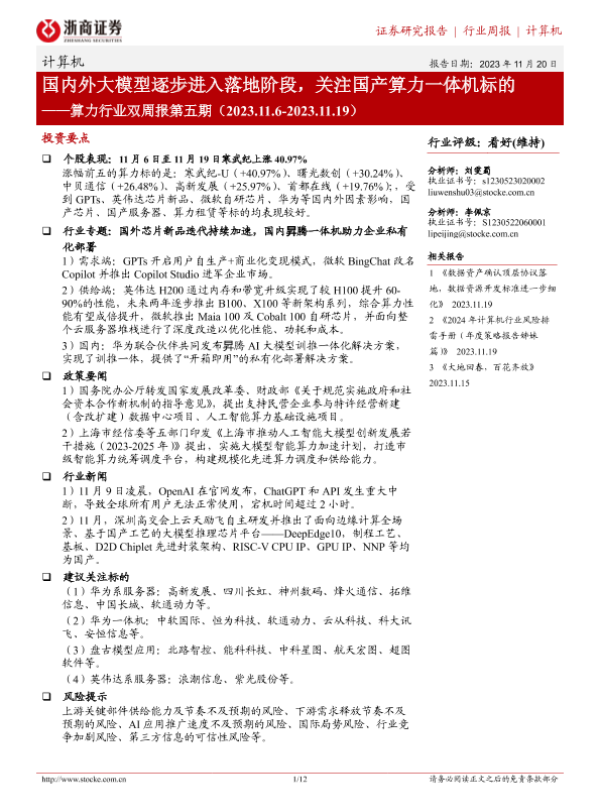 【浙商证券】【20231120】20231120-浙商证券-算力行业双周报第五期:国内外大模型逐步进入落地阶段,关注国产算力一体机标的-12页 行业研究