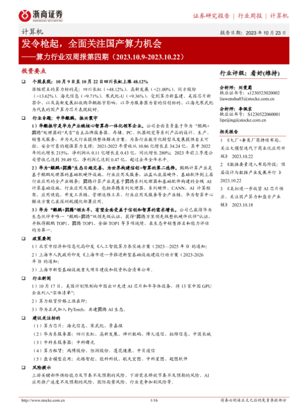 【浙商证券】【20231023】算力行业双周报第四期:发令枪起,全面关注国产算力机会-16页 行业研究