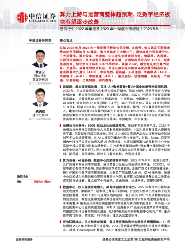 【中信证券】【20230508】通信行业2022年年报及2023年一季度业绩综述-39页 行业研究