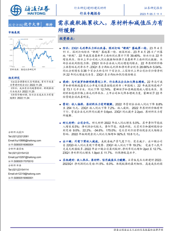 【海通证券】【20230511】建筑材料行业:需求疲软拖累收入,原材料和减值压力有所缓解-24页 行业研究