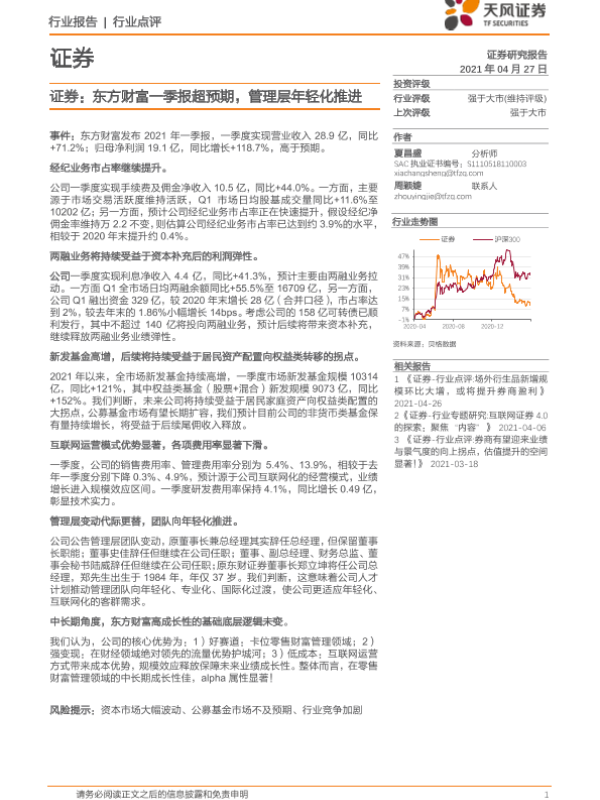 【天风证券】【20210427】东方财富一季报超预期,管理层年轻化推进-2页 行业研究