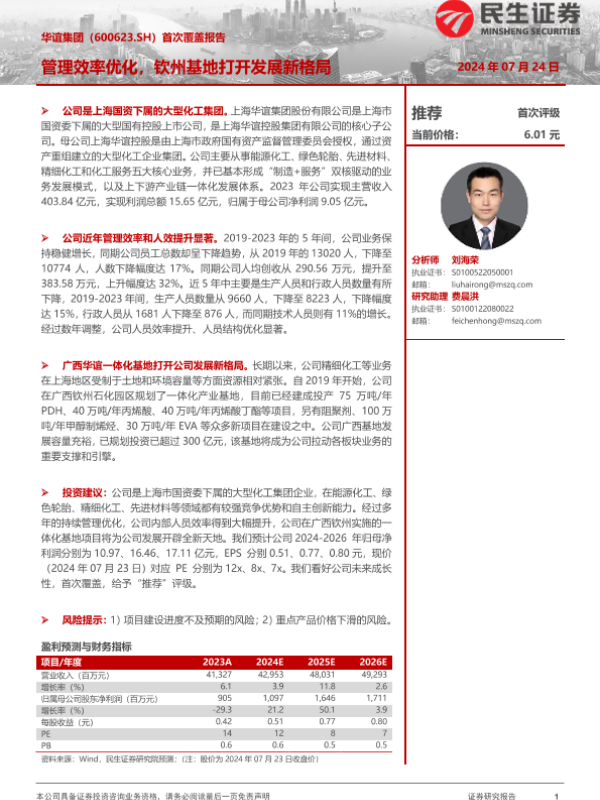 【民生证券】【20240724】华谊集团(600623)首次覆盖报告:管理效率优化,钦州基地打开发展新格局-20页 行业研究