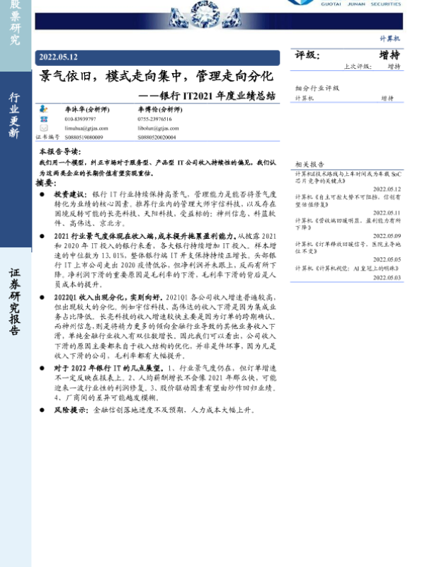 【国泰君安证券】【20220512】银行IT2021年度业绩总结:景气依旧,模式走向集中,管理走向分化-8页 行业研究