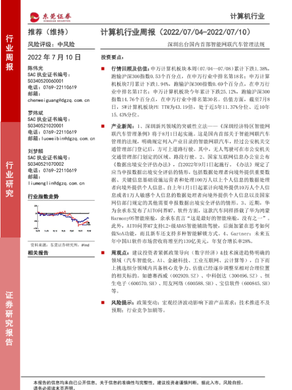 【东莞证券】【20220710】计算机行业周报:深圳出台国内首部智能网联汽车管理法规-7页 行业研究