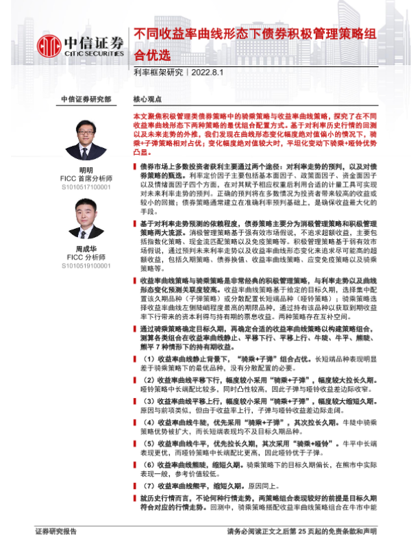 【中信证券】【20220801】不同收益率曲线形态下债券积极管理策略组合优选-26页 行业研究