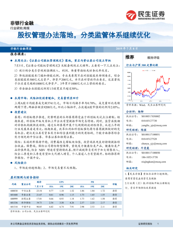 【民生证券】【20190708】非银行金融周报:股权管理办法落地,分类监管体系继续优化-10页 行业研究